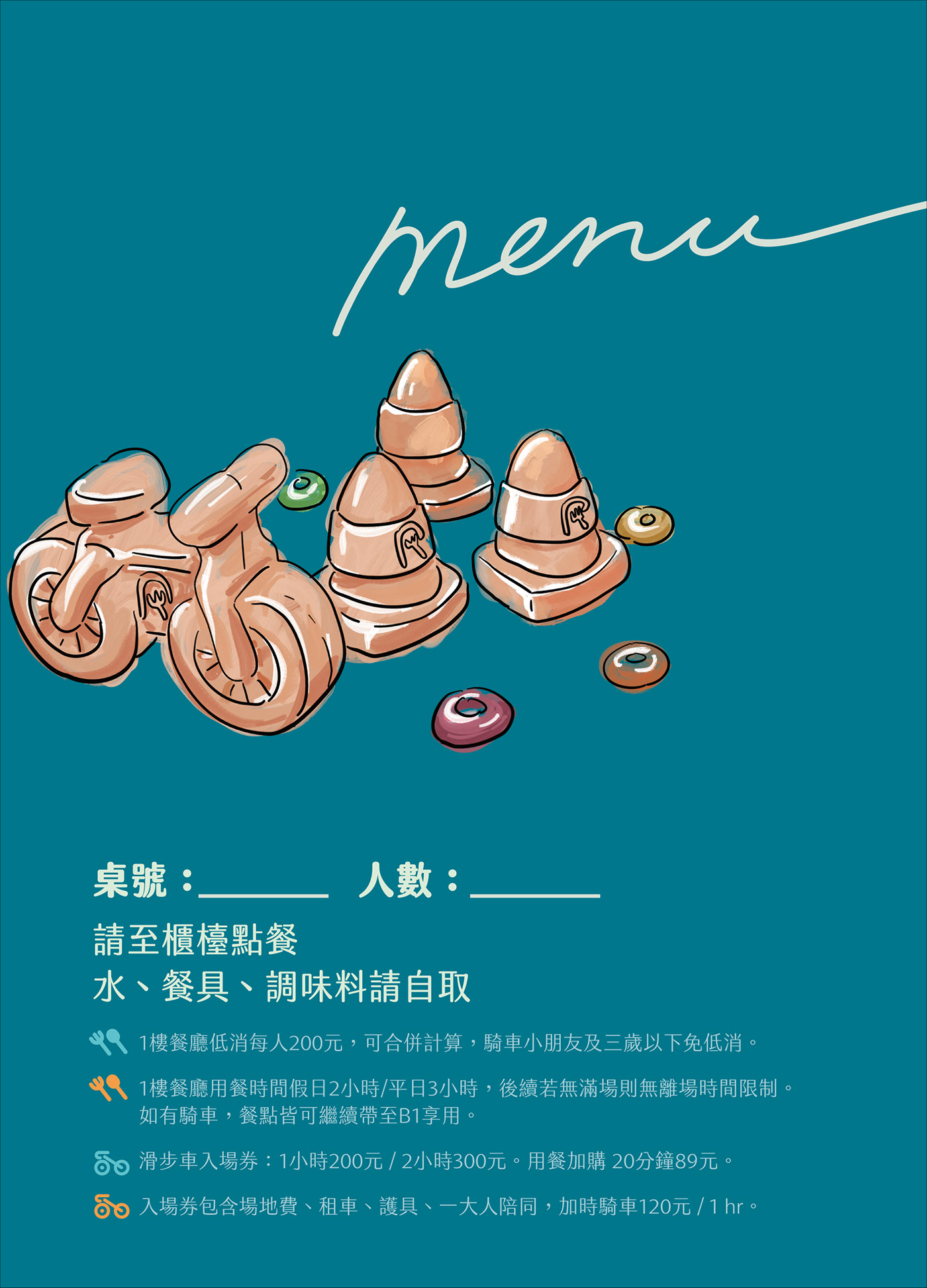 針對不同使用時段設計的入場票券,區分 1 小時與 2 小時方案。色彩系統與品牌主色調保持一致,讓票券本身也成為值得收藏的品牌觸點。